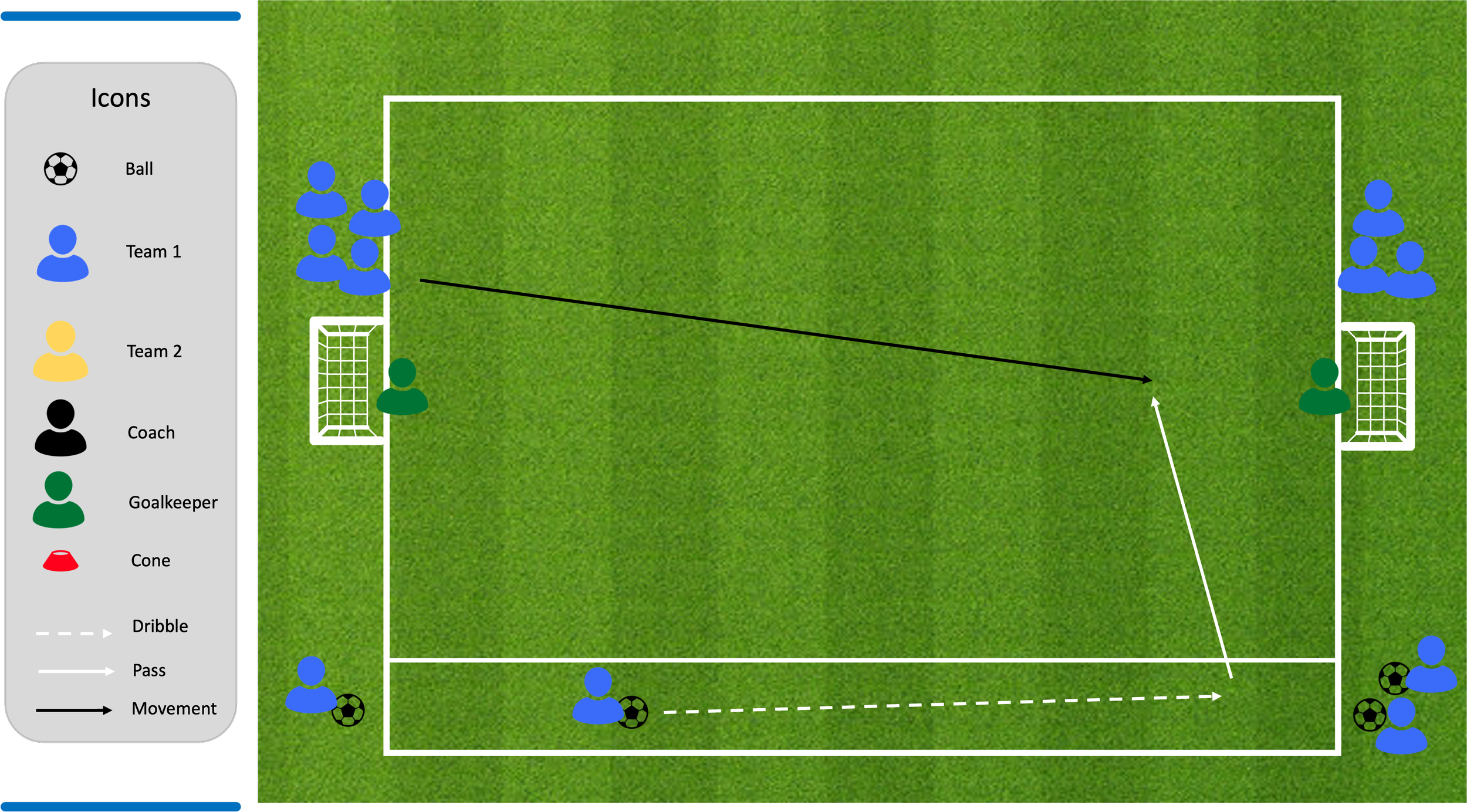 Wide players practice crossing with both feet, and strikers practice finishing from crosses