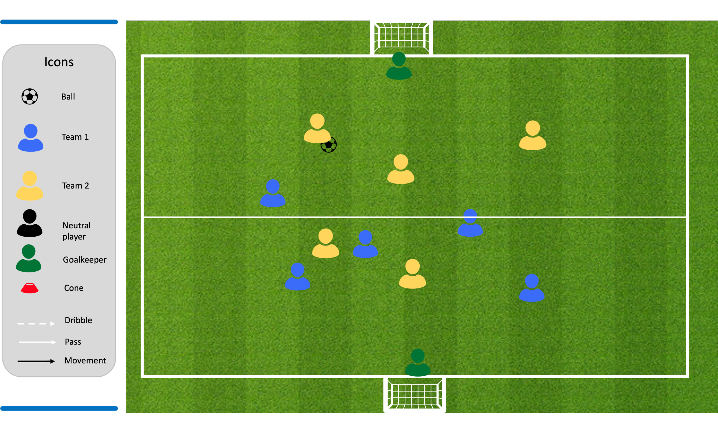 Players are free to move anywhere on the pitch, however can only score from their own half.